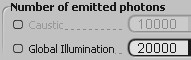 20000 for the global-illumination effect. This value specifies the number of photons that the light emits. Lower values (like 1000), cause fuzzy puddles of light but render faster, so it's good for tests. High values will create smooth Global Illumination effects but render much slower and are better for final renderings. |