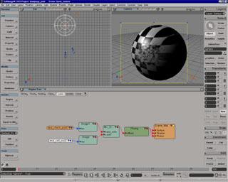 We can now translate this method into vector maths.First of all, we create two bump map generator nodes, one for each image and reload the sources of the images into these, with corresponding projections, so that we have a bump map version of our colour image nodes. As you can see, these nodes output vector variables(the yellow output) which we can plug directly into the bump map input of the illumination model.